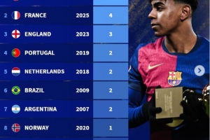 各国球员赢得金童奖次数排行:西班牙5次居首,法国4次位居第二