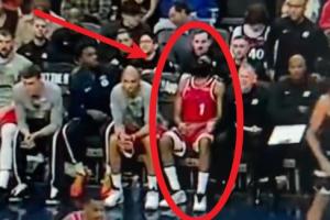 有点疲惫?哈登被换下场一屁股瘫坐在板凳上&抬头仰面