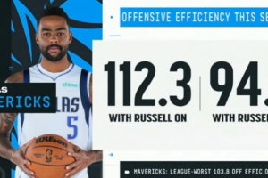 还用弗拉格打1?拉塞尔在场时独行侠进攻效率112.3 下场后为94.7