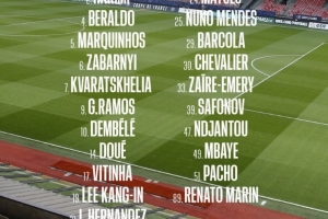 巴黎本轮法甲大名单:登贝莱、K77领衔,内维斯、法比安伤缺